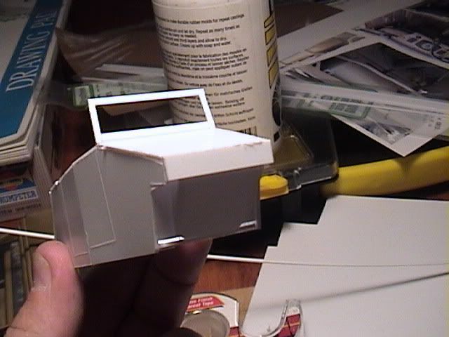 Now the fun starts. Here I began cutting the front, side, and rear panels from Evergreen .030" sheet styrene. The panels were scribed with interior detail prior to assembly, relying heavily on visual references for placement. One of the doors was cut out to be displayed open, but this is a matter of personal preference. The bottom panel was to be cut later, using the assembled main body as a guide. The windshield frame was cut from .020 X .060" styrene strip.