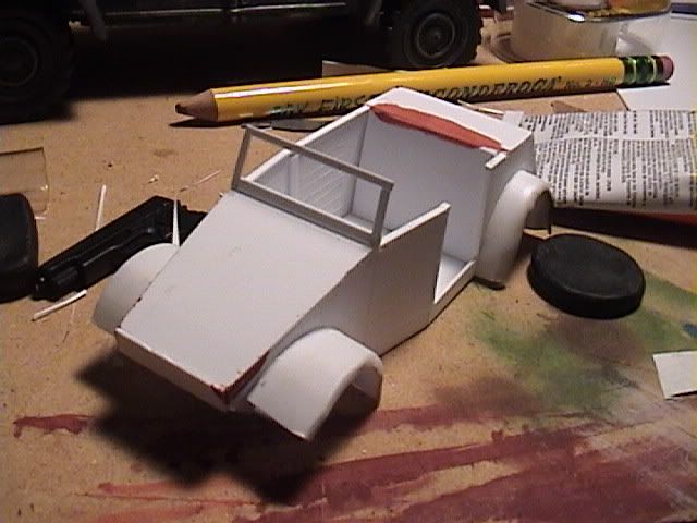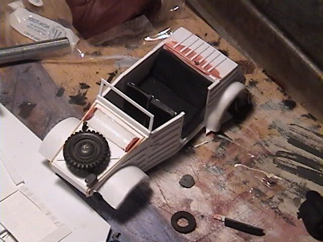The seats, headlights, and various attachments poking up from the front of the vehicle were all made from Sculpey. A toothpick was dragged across the seats to simulate wrinkles in the fabric, but for the most part the detail applied was minimal. After baking, seats received frames made of styrene strip (.030 X .080" for the uprights and .020 X .060 for the crossmembers). A crude dashboard and instrument panel were cut from .030" sheet and a shifter was made from stretched sprue which was then heated and balled on one end.
