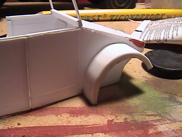 The fenders were then bent around the shape of the form and the ends were secured in place with lumps of clay. The form was positioned 1/8" or so below the top edge of the styrene fender shapes. The top edge was then heated and pressed against the form to create the fender edge. This also helped to solidify the curvature of the fender itself.