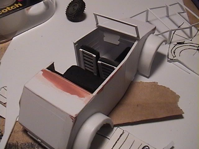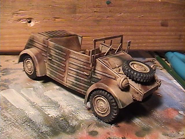 The body was airbrushed using Model Master basic colors (they don't have the Panzer colors in my area...grrrrrr) The body was sprayed overall with Sand, followed by a camo pattern using Leather and Dark Green. Seats were painted with "little old lady paints" (craft paint by Apple Barrel, Americana, FolkArt, etc.) as were the tires. The color I used for the seats was called "Honey", I think. Tires were plain ol' flat black.