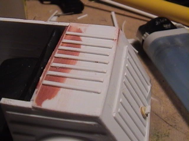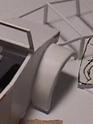 Next came the corrugated sides. This was the most time-consuming and tedious part of the project, but also the stage that began to really bring things together and make the model begin to look like what it was supposed to be. The corrugation lines were cut to fit from .020 X .040" styrene strips, with each piece custom-fitted to its location. In several places, it was feasible to measure and cut one, then use it as a pattern for nearby strips, but in other places the cutting and fitting had to be done on a case-by-case basis--very tedious! The latch for the engine compartment was constructed of a thin slice of sprue with .020" strip attached, then placed on the rear deck.